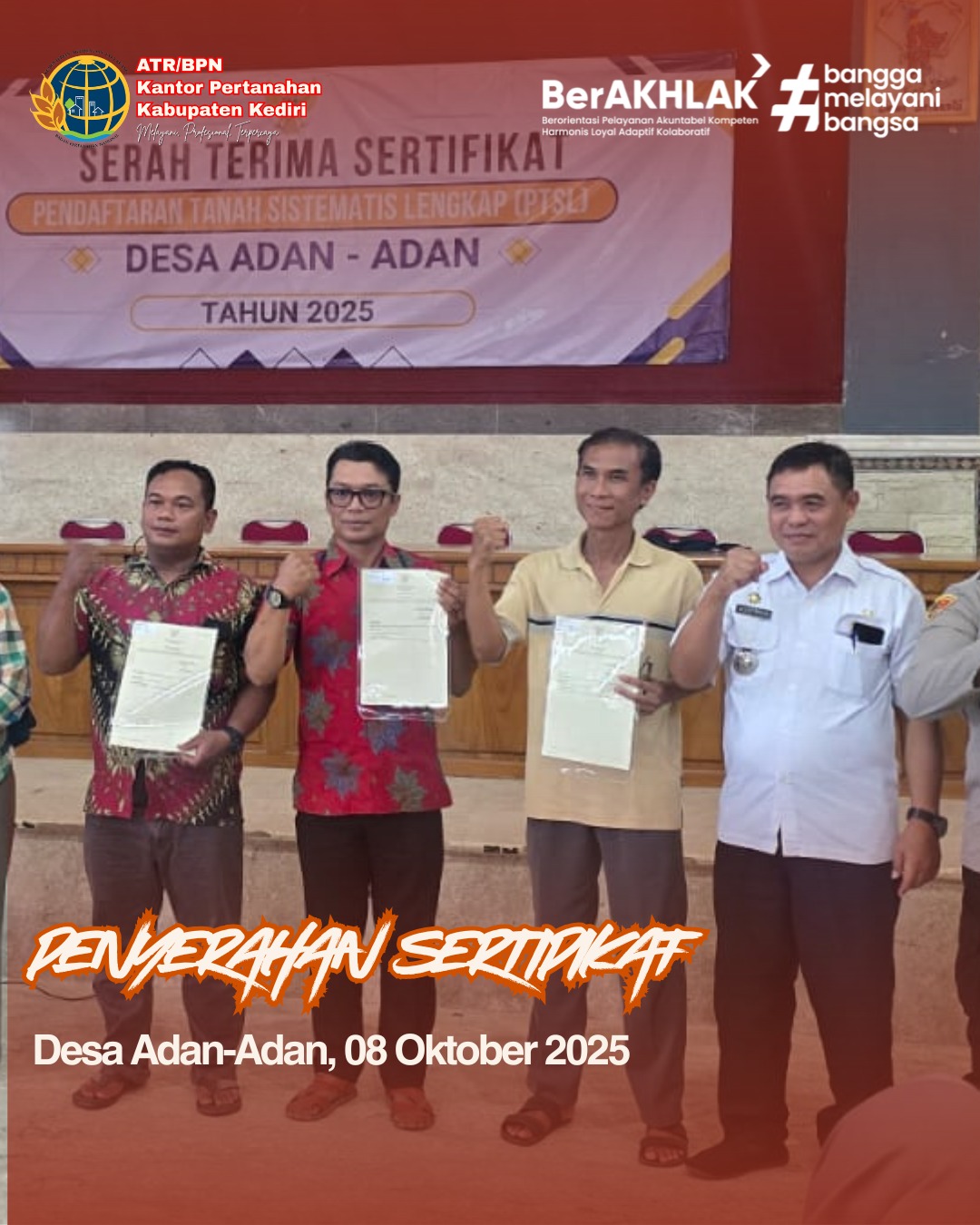 Kediri,Montera.co.id—SobATRBPN, dalam melaksanakan amanah masyarakat Kabupaten Kediri, pada hari ini Rabu (08/10/2025) Kantor Pertanahan Kabupaten Kediri melaksanakan giat penyerahan sertipikat pada Desa Adan-Adan, turut dihadiri oleh kepala Desa, giat berjalan dengan lancar dan Kondusif.(*/Mon)