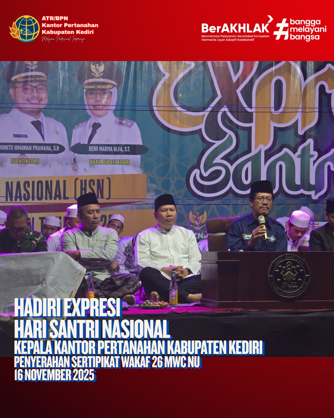 Kediri,Montera.co.id—masih dalam suasana hari santri nasional nih, dengan diselenggarakannya Expresi Hari Santri Nasional yang diselenggarakan di Simpang lima gumul pada hari Minggu(16/11/2025) lalu, pada kesempatan yang sama Kepala kantor pertanahan kabupaten kediri melaksanakan penyerahan sertipikat wakaf sebanyak 26 sertipikat kepada MWC, berlokasi di simpang lima gumul kecamatan ngasem kabupaten kediri, giat berjalan dengan lancar serta kondusif.