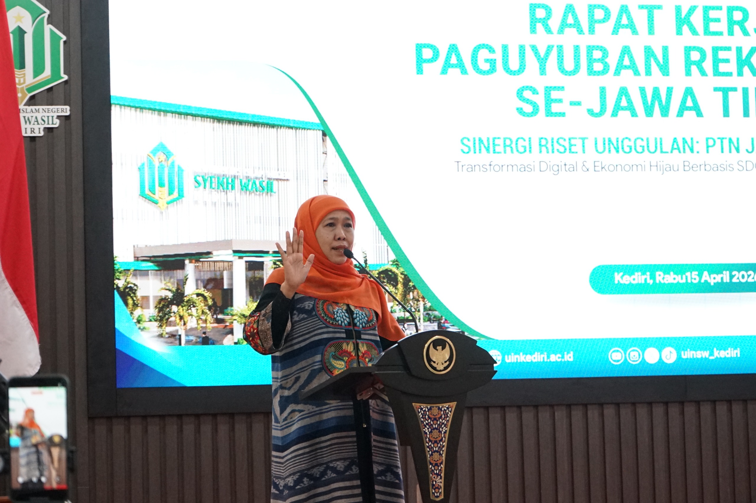Kediri,Montera.co.id– Gubernur Jawa Timur, Khofifah Indar Parawansa, resmi meluncurkan program strategis “Riset Kolaboratif PTN Jatim Melaju 2026”. Peluncuran ini dilakukan pada agenda Rapat Kerja I Paguyuban Rektor Perguruan Tinggi Negeri (PTN) se-Jawa Timur yang berlangsung di Gedung UIN Syekh Wasil Kediri, Rabu (15/4/2026).