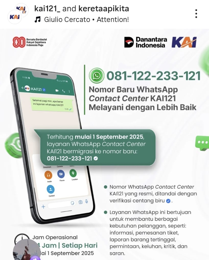 ​Mulai 1 September 2025, pelanggan kini wajib menghubungi nomor baru 0811-2223-3121 untuk mengakses WhatsApp Contact Center KAI121.