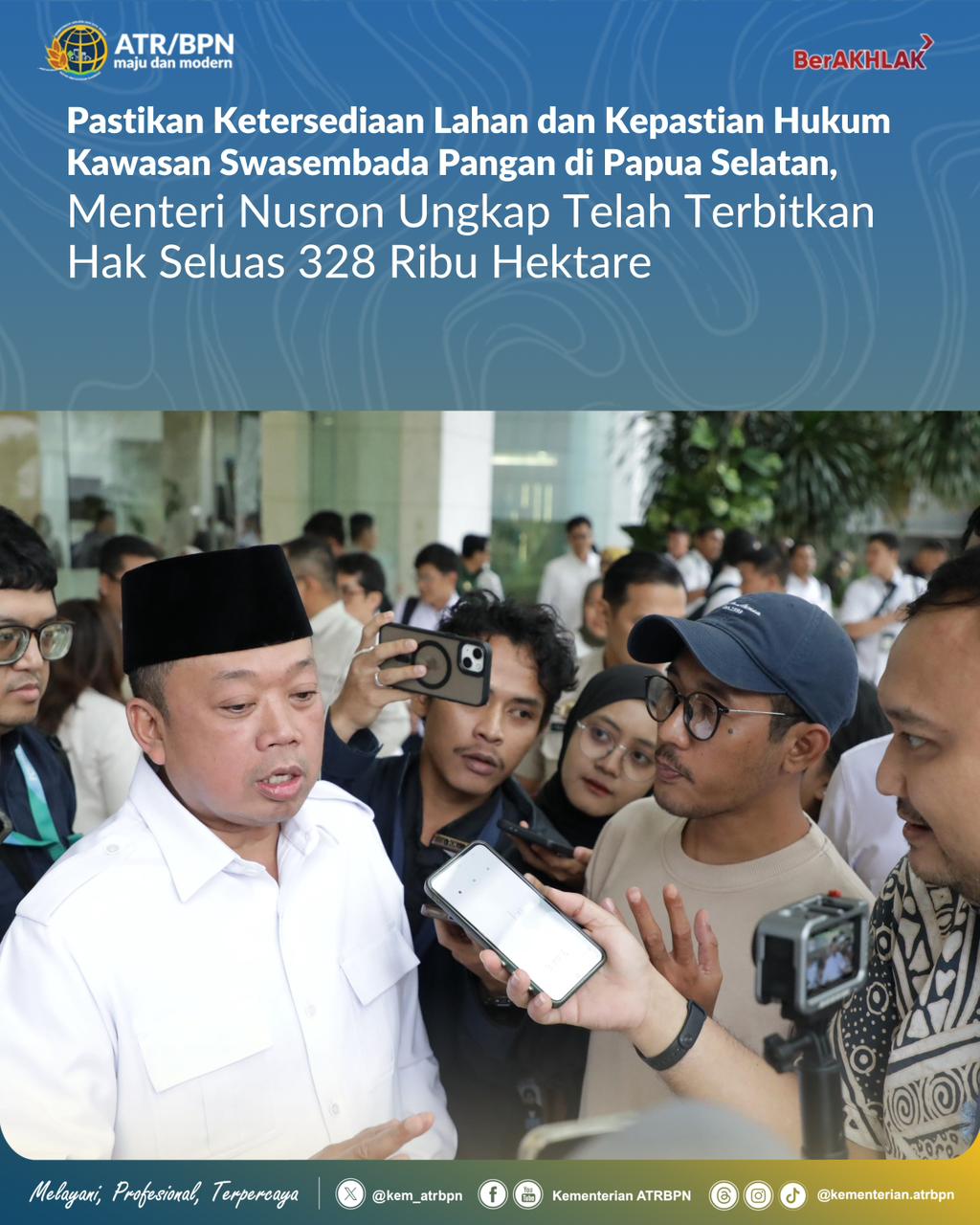 https://www.atrbpn.go.id/berita/pastikan-ketersediaan-lahan-dan-kepastian-hukum-kawasan-swasembada-pangan-di-papua-selatan-menteri-nusron-ungkap-telah-terbitkan-hak-seluas-328-ribu-hektare