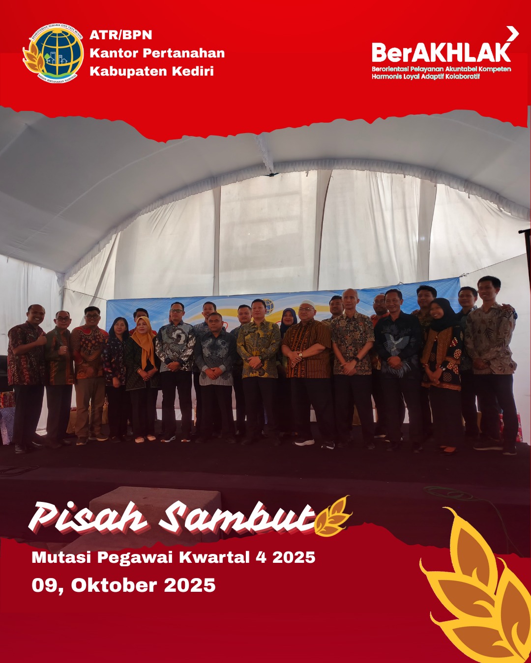 Kediri,Montera.co.id--ATRBPN untuk melaksanakan manajemen SDM yang baik pada lingkungan Kementerian ATR/BPN, maka dilaksanakanlah mutasi dan promosi pegawai, tidak terkecuali pada Kantor Pertanahan Kabupaten Kediri, pada hari ini Kamis (09/10/2025) dilaksanakanlah pisah sambut serta serah terima tugas pegawai kantor pertanahan kabupaten kediri yang telah mutasi tertanggal awal oktober lalu, dibuka langsung oleh kepala kantor pertanahan kabupaten kediri, turut dihadiri oleh kepala kantor pertanahan kota kediri giat berjalan dengan lancar.(*/Mon)