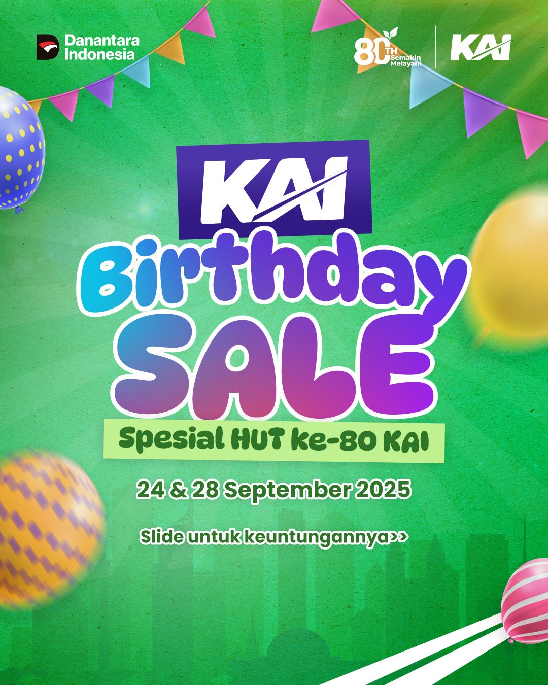 “Delapan puluh tahun adalah perjalanan panjang penuh dinamika, tetapi semangat KAI tetap sama yaitu melayani. Mari rayakan HUT ke-80 bersama kami, dan pantau seluruh promo spesial ini di Access by KAI sesuai jadwal dan ketentuan untuk perjalanan yang semakin berkesan,” tutup Zainul. (Chap/Al)