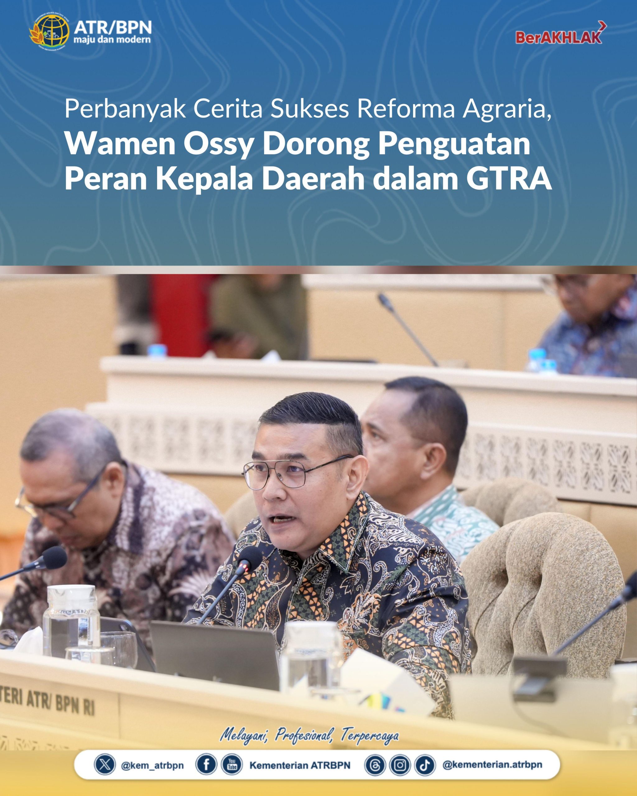 “Fokus pertama adalah penyederhanaan dan perbaikan _business process_, baik di tingkat pusat maupun daerah. Saat ini, Kementerian ATR/BPN memiliki 527 satuan kerja (Satker) di seluruh Indonesia. Maka, proses pelayanan harus semakin mudah, namun tetap akurat karena produk yang kami hasilkan bersifat hukum. Cepat bukan berarti tidak teliti,” jelas Wamen Ossy.