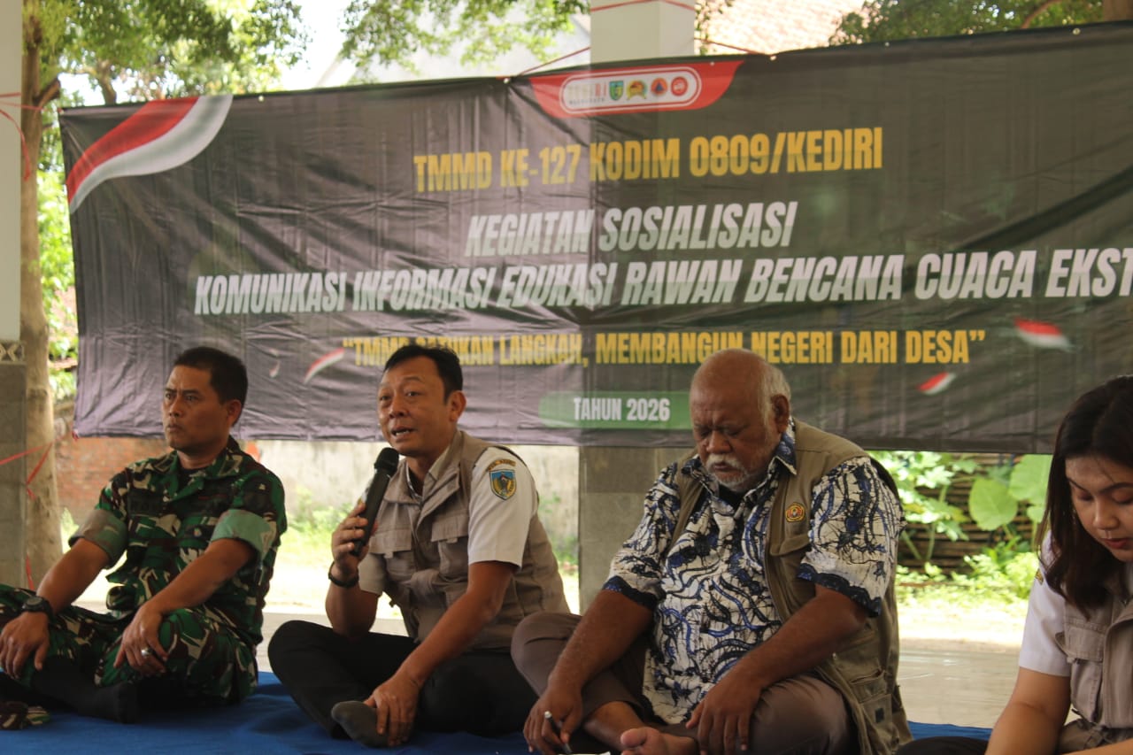 Kediri,montera.co.id– Ancaman bencana hidrometeorologi seperti hujan lebat dan angin kencang menjadi perhatian serius Badan Penanggulangan Bencana Daerah (BPBD) Kabupaten Kediri. Mengingat cuaca ekstrem yang sulit diprediksi, BPBD bersama TNI menggelar sosialisasi Komunikasi, Informasi, dan Edukasi (KIE) di kawasan rawan bencana di Desa Gadungan, Kecamatan Puncu, Kamis (26/2/2026).